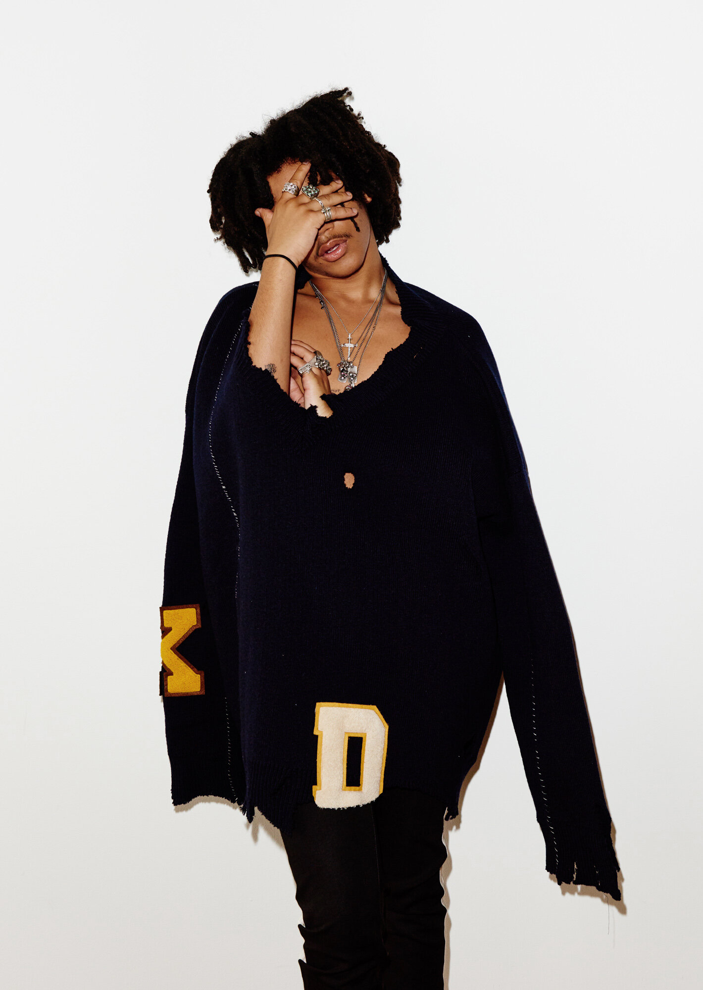 Person with curly hair wearing a black torn sweater with yellow patches and multiple jewelry, covering face with hand, standing against a white background. View fullsize