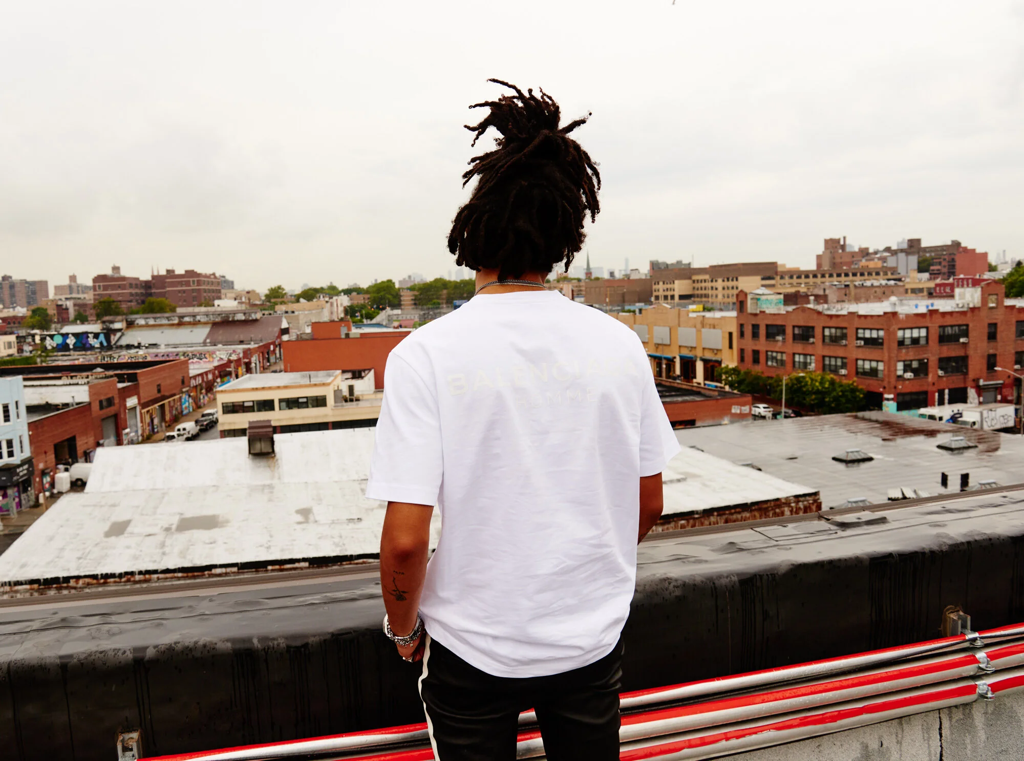 Person with dreadlocks standing on rooftop overlooking cityscape of buildings and streets during daytime. View fullsize